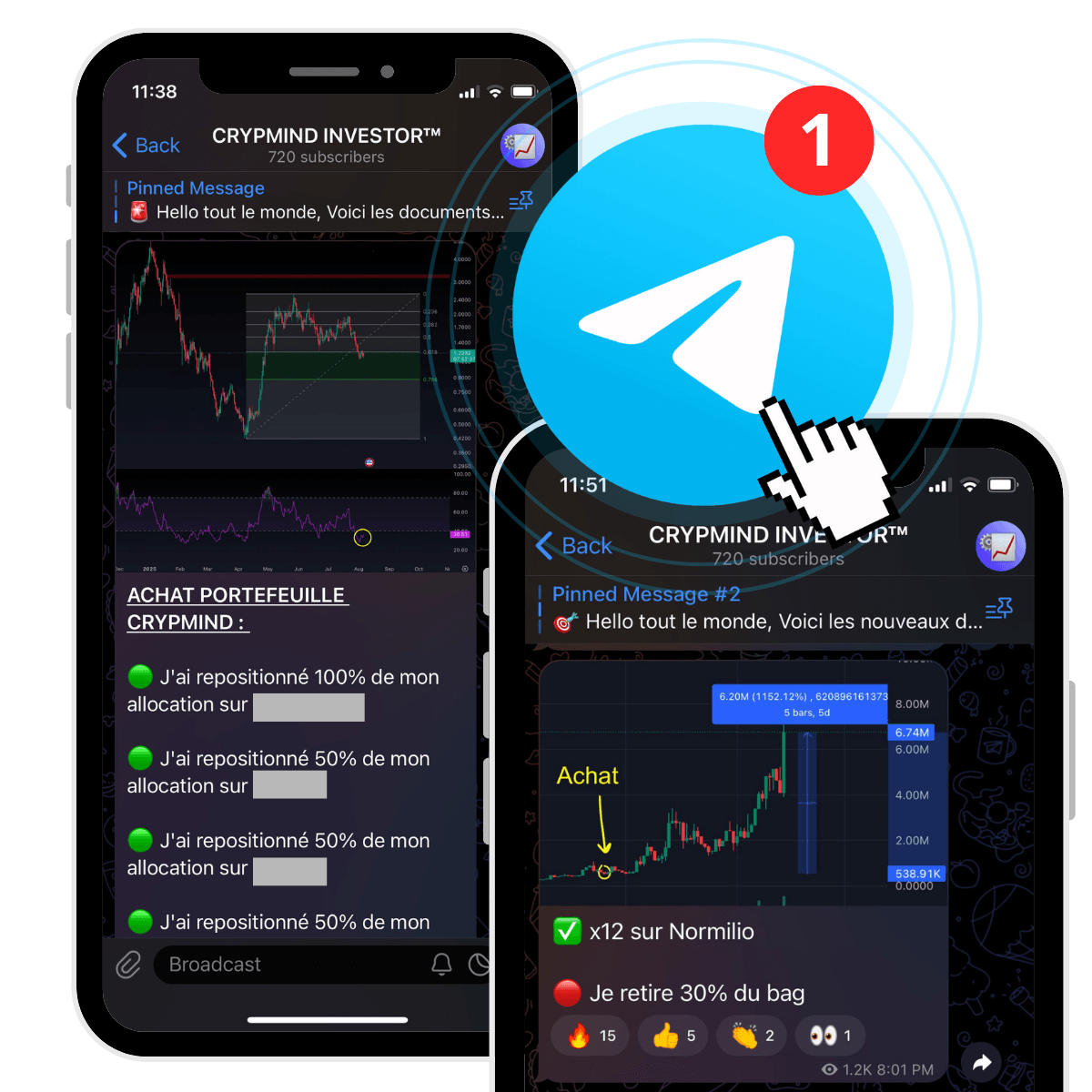 Tu auras aussi accès au canal privé Telegram dans lequel je te partagerai mes investissements cryptos (les moments d'achat ainsi que les moments de vente). Je te partagerai toutes les opportunités que je trouverai.